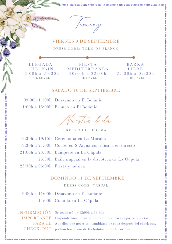 El sábado 10 de septiembre por la tarde tendrá lugar la ceremonia en los jardines de Villaitana. Por la noche celebraremos el banquete en el edificio principal de Villaitana seguido de una fiesta para terminar el día de la mejor manera posible.